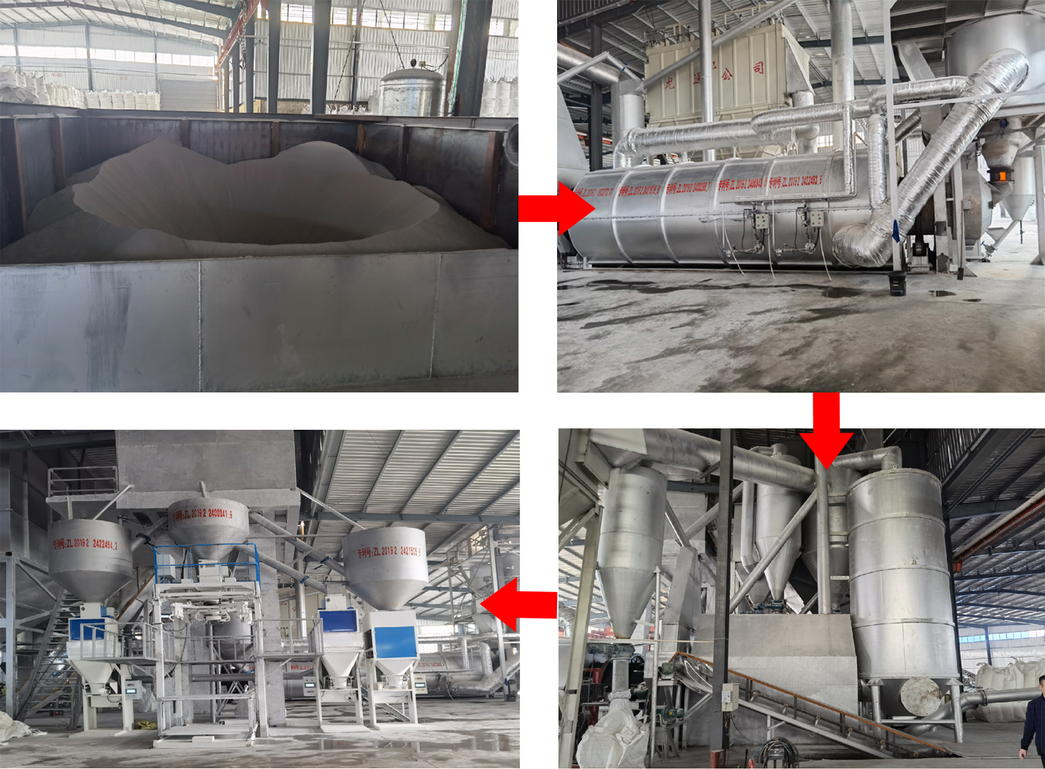 一次性可投放100T原材料,料倉側(cè)壁有收風(fēng)口收塵,物料經(jīng)過輸送帶輸送至預(yù)熱爐中,預(yù)熱爐為雙層滾筒,大筒與小筒互套在一起,物料直接進(jìn)入到內(nèi)筒中,通過烘干、預(yù)熱、脫水處理,處理結(jié)束后經(jīng)提升機(jī)提升至膨化爐中對(duì)物料進(jìn)行膨化,主爐膨化后的產(chǎn)品柔性回流至預(yù)熱爐中心筒經(jīng)過余熱回收管理系統(tǒng)收集余熱后,進(jìn)入金輝專利技術(shù)懸浮法五級(jí)風(fēng)選(把未完全閉孔的產(chǎn)品分類收集),風(fēng)選過后的產(chǎn)品進(jìn)入成品倉通過輸送機(jī)提升至柔性篩分系統(tǒng)(把未完全膨化的燒結(jié)砂篩除掉),最終經(jīng)過級(jí)配管道流入定量包裝系統(tǒng)進(jìn)行包裝,以上程序可以保證松銤維鉑的閉孔率和漂浮率,金輝公司宗旨是以高品質(zhì)產(chǎn)品服務(wù)于市場。